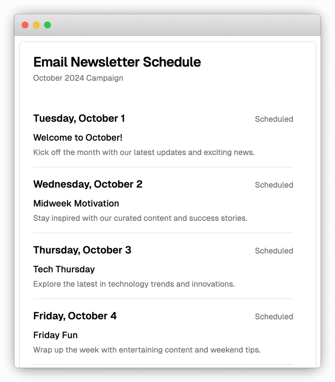 - Whether you want to send weekly updates or daily insights, Newsletter Pilot adapts to your schedule. Control the frequency and timing to match your audience’s preferences without lifting a finger.